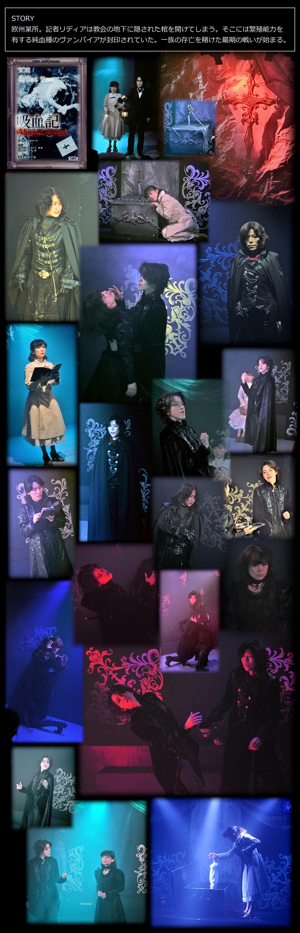 「 吸血記 Vampire chronicie 」 作・演出 花本ロミオCAST リディア・グレイス:笹原 千寿 エスタ:澪 みちる シェイド:悠貴 レヴァン:沢渡 あき エドアール・スタイン:陵 陵 ダンピール族長:さえぐさみえ ダンピール:634 UME◎2011年上演 photo:Makky Gallery リストへ 戻る